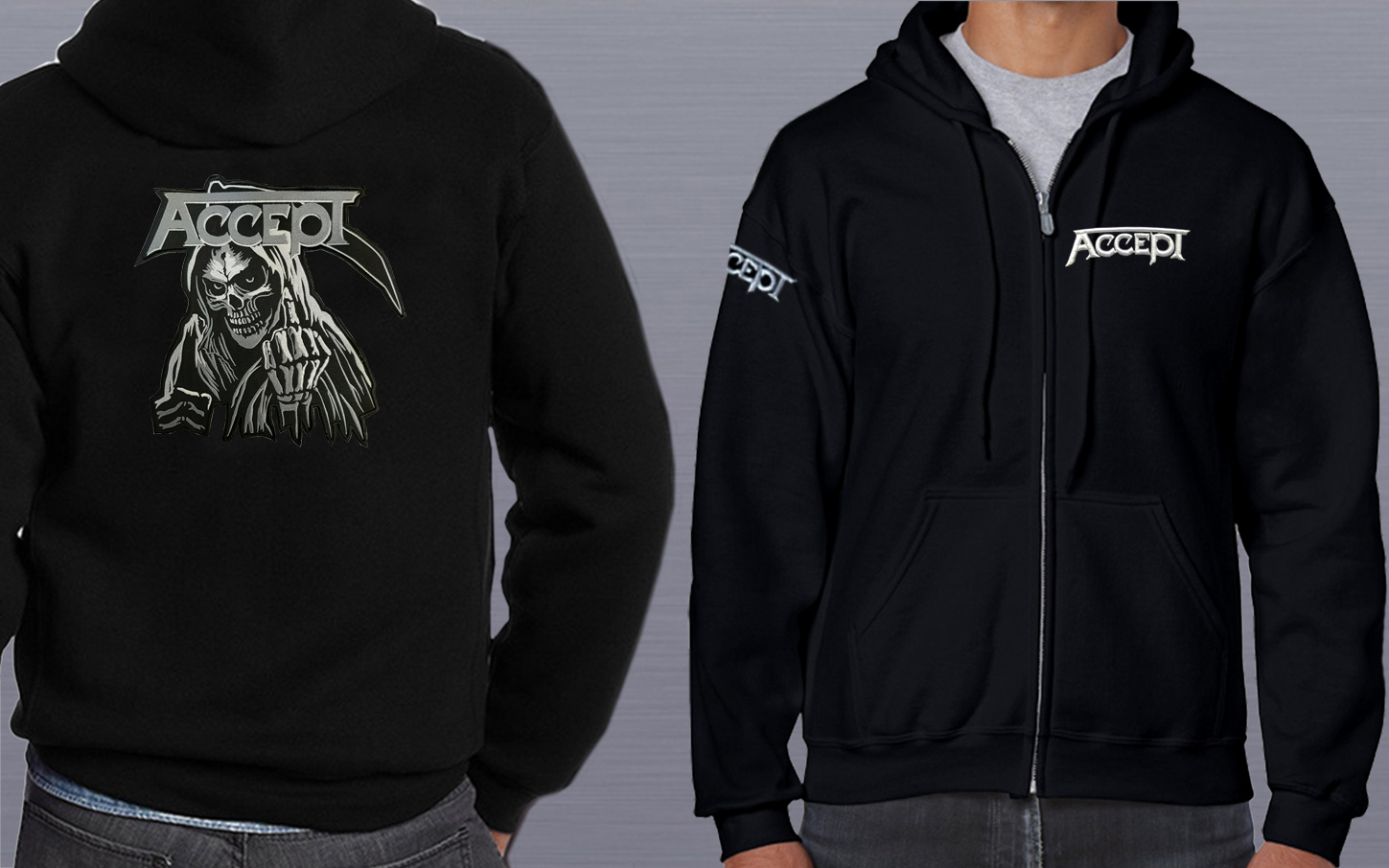 Pánská celopropínací mikina s kapucí a přední kapsou v podobě "klokanky". Kapuce s podšívkou na stažení pomocí šňůrky. Sedla a kapsy s dekorativním prošitím. Spodní lem a manžety rukávů ze žebrového úpletu s přídavkem 5 % elastanu. Vnitřní část průkrčníku začištěna tkanou páskou. Na zádech velká výšivka.Na rukávu vyšité logo kapely.Ve přední části 3D výšivka.